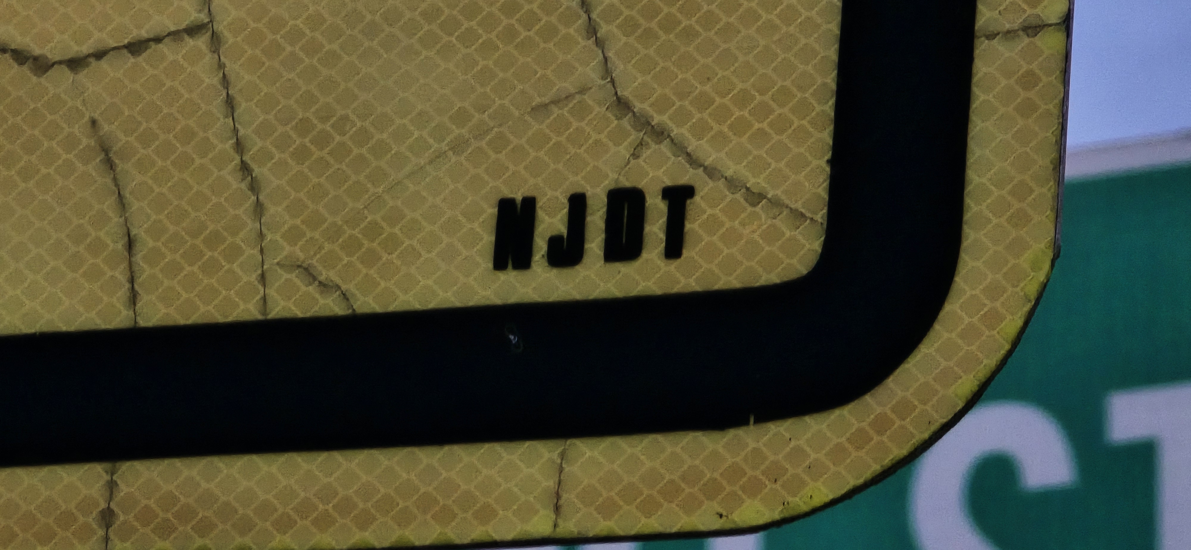 An old crosswalk sign in downtown Morristown. The sign finish has cracked and faded, and there's an old NJDT label on the corner of the sign.